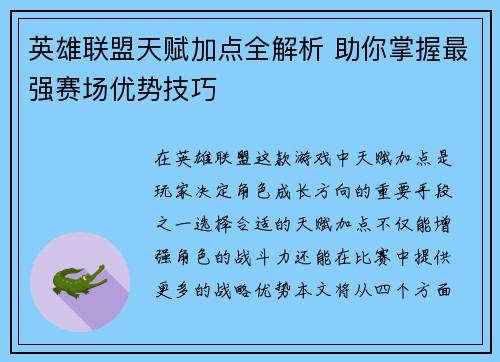 英雄联盟天赋加点全解析 助你掌握最强赛场优势技巧