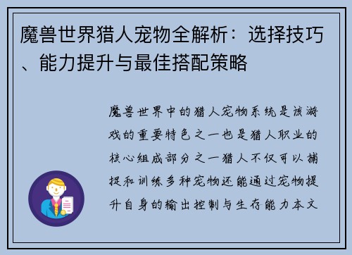 魔兽世界猎人宠物全解析:选择技巧、能力提升与最佳搭配策略